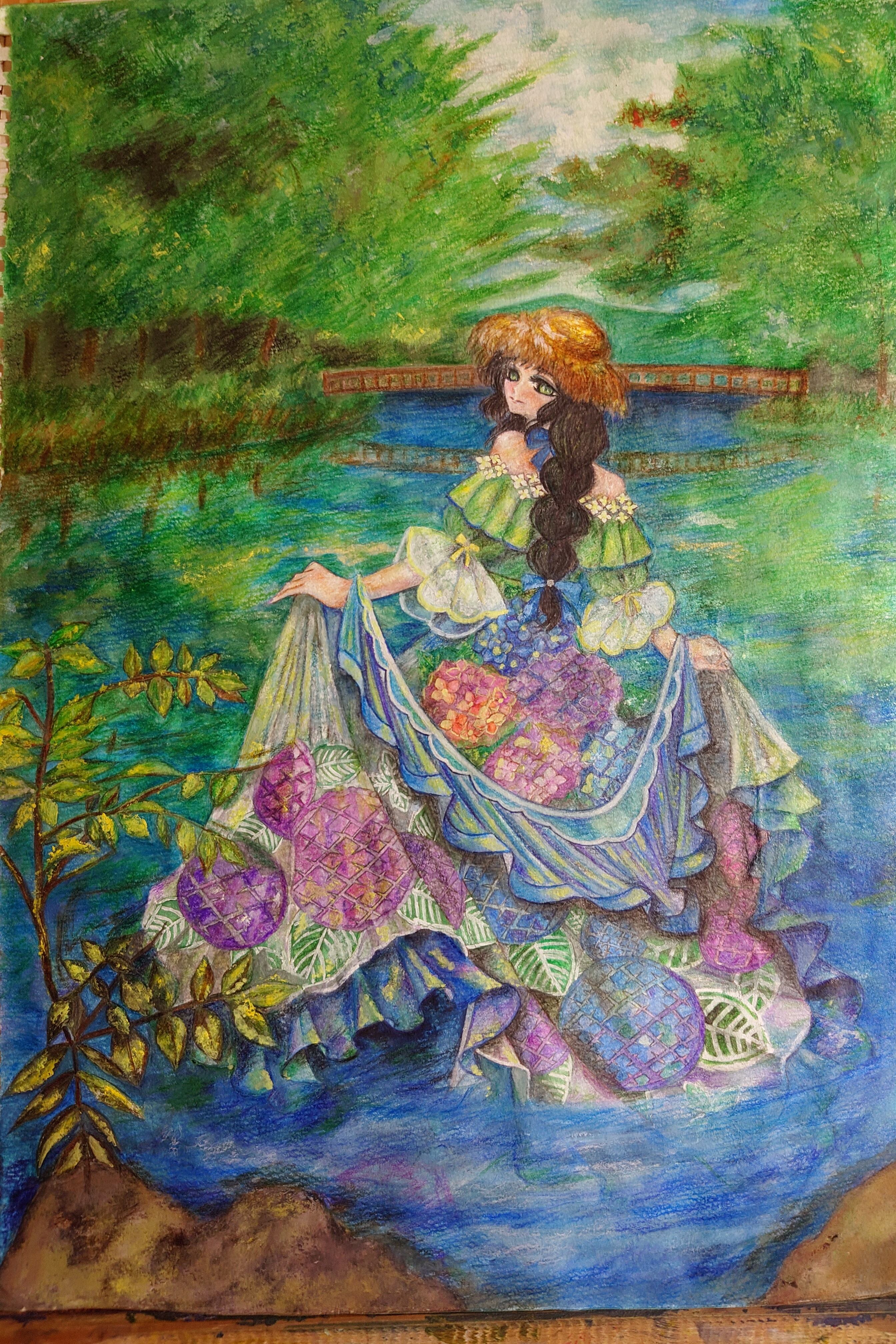 そんな梅雨の、象徴とも言える紫陽花をふんだんにあしらったドレスを着、涼やかに足を浸してこちらを見つめる女性。